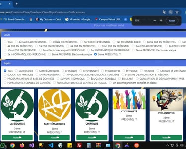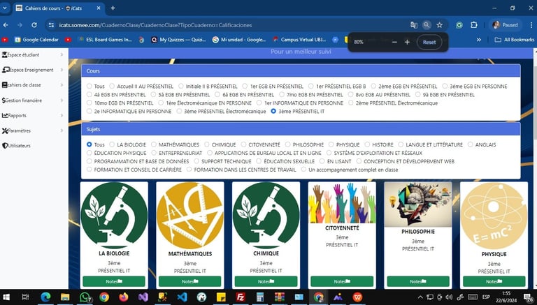 Gestion des matières, cahiers de classe, cours et niveaux.